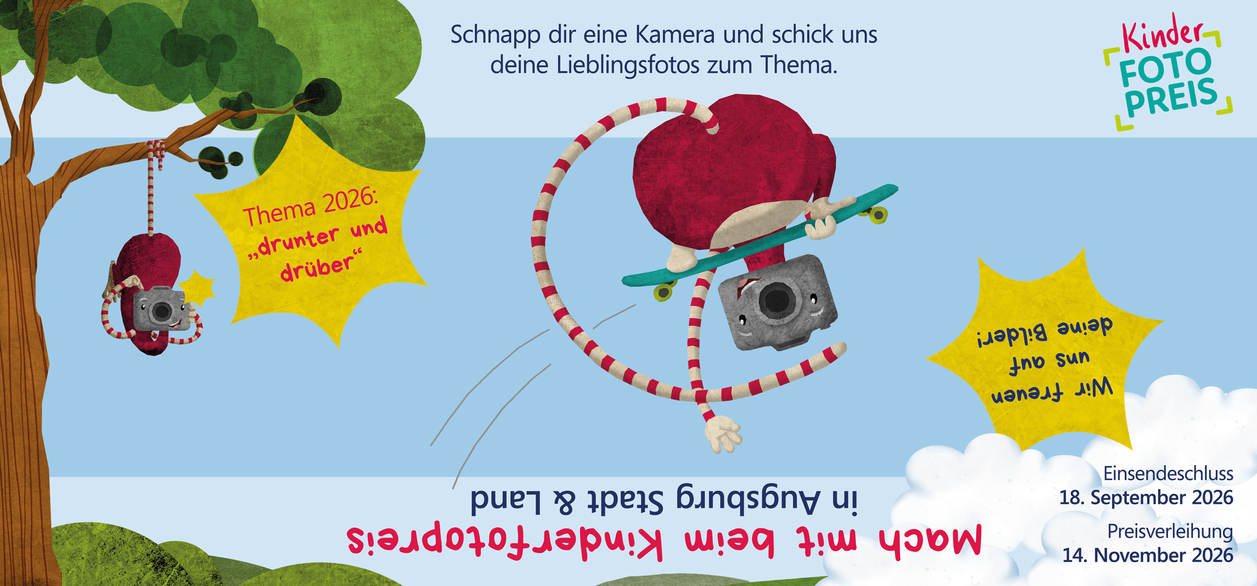 Beim Kinderfotopreis Augsburg Stadt & Land sind alle Kinder zwischen 3 und 12 Jahren eingeladen, ihre ganz eigene Sicht auf die Welt zu zeigen. Das diesjährige Motto „drunter und drüber“ steckt voller spannender Möglichkeiten – und vor allem voller Spaß!